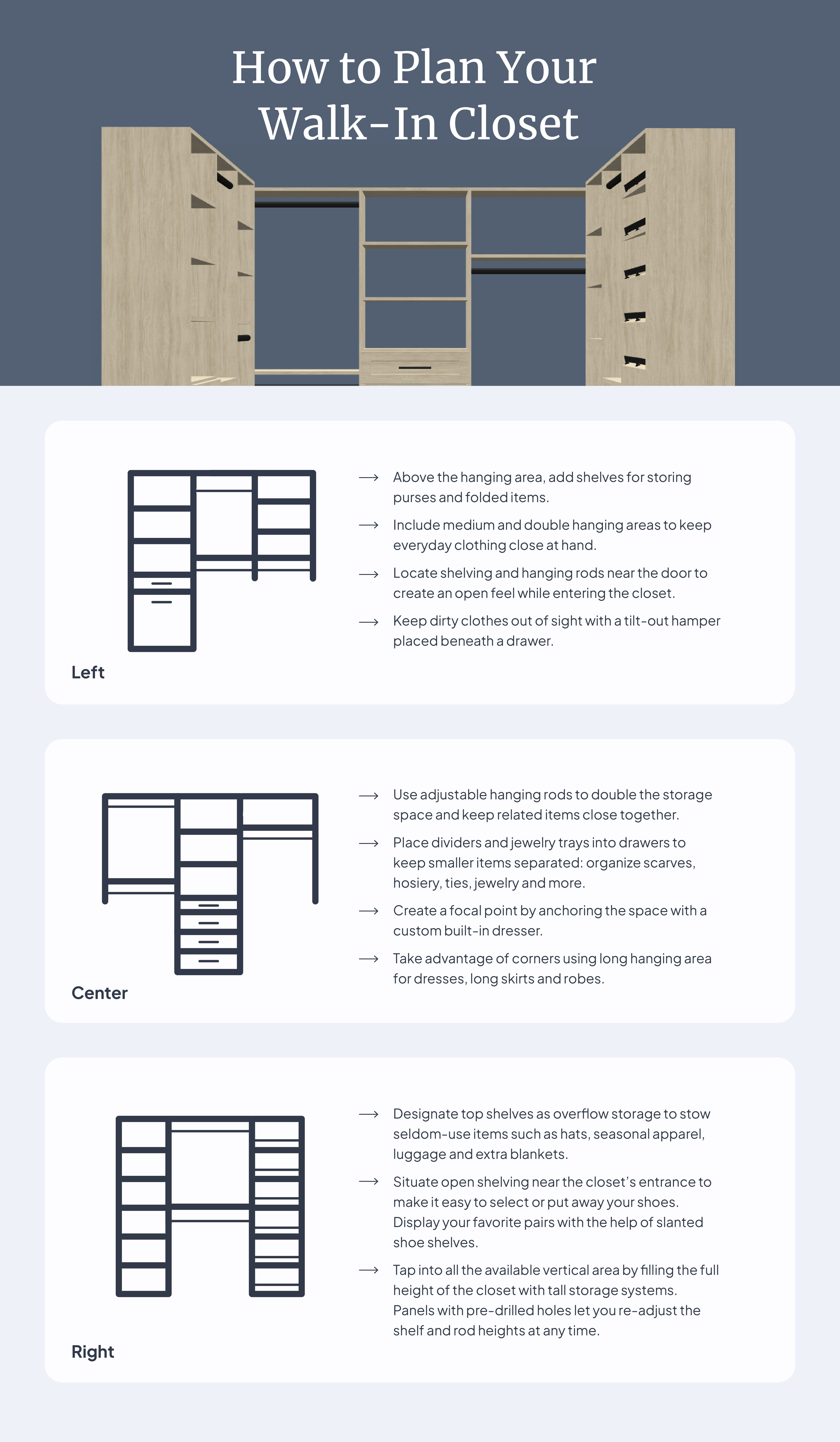 Plan your closet layout around how you get dressed each day. Group clothes by type or frequency of use and consider including a valet rod for outfit planning or a built-in hamper to simplify laundry day.